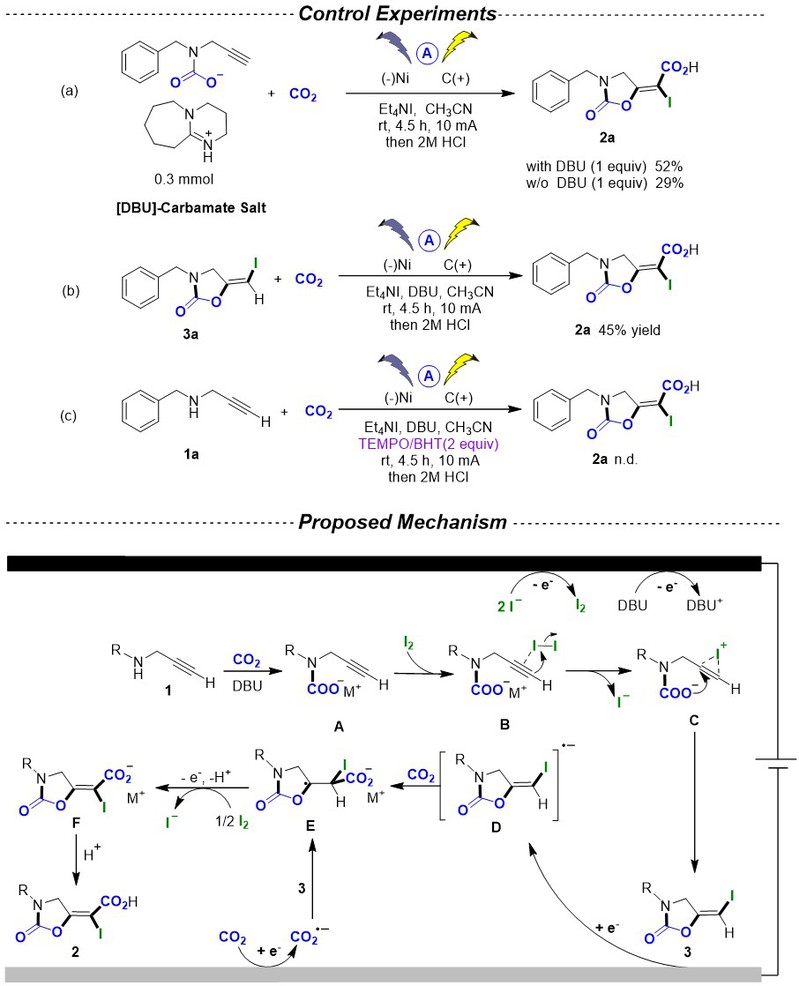 1.本研究提出了一种全新的电化学策略,在温和条件下实现了1 mol炔丙胺与2 mol CO2的协同转化。