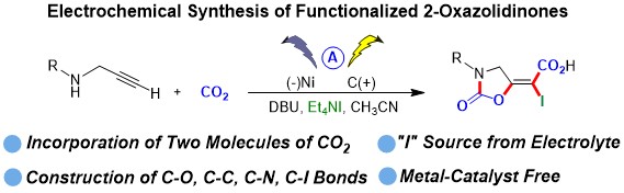 现代社会的高碳排放导致大气中二氧化碳浓度持续升高,引发气候与环境问题。从可持续化学角度看,二氧化碳作为一种丰富、无毒且可再生的碳一资源,可用于合成大宗化学品及高附加值产物,包括碳酸二甲酯、甲酸、环状碳酸酯、2-噁唑烷酮、杂环化合物等。其中,2-噁唑烷酮作为一类重要的含氮杂环化合物,广泛用于药物、农用化学品和有机合成,例如抗菌药物利奈唑胺(linezolid)就含有这一骨架。目前,过渡金属、离子液体、有机小分子体系都已用于2-噁唑烷酮的合成,光化学方法通过向体系中引入自由基前体,实现了多官能化2-噁唑烷酮的合成。这些反应都已得到了极大的发展,但通常引入一个CO2单元,不易实现高效的多分子利用。电化学方法因绿色、高效且可直接借助可再生能源驱动,正在成为解决这一难题的有力工具。