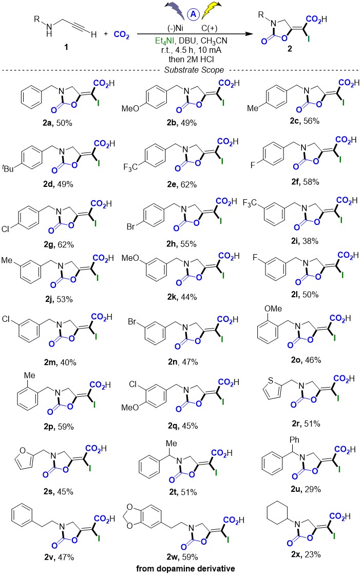 2.使用四乙基碘化铵作为(Et4NI)电解质,通过原位生成的碘活化炔丙胺,实现高效环化与羧化反应。