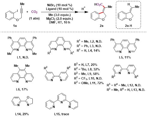 首先,本研究以碘苯串联炔丙基醚1a为模板底物,对反应条件进行了系统筛选。在配体结构优化过程(图2)中发现,无论使用菲罗啉型还是联吡啶型配体,当氮原子邻位存在取代基时,均未检测到目标产物2a,而是生成质子化副产物2a-H。该结果表明,氮邻位取代基的空间位阻效应会显著抑制CO2对C–Ni键的插入。进一步研究表明,采用氮原子对位为甲氧基取代的联吡啶配体L11可有效提升反应效率,将2a的产率提高至72%,可能是由于L11的给电子效应增强了镍中心的电子密度,进而促进了其对CO2的亲核进攻。除配体外,添加剂与碱的筛选也对反应效率具有关键影响。控制实验表明,MgCl2在本转化中不可或缺,其作用机理包括促进镍催化剂的还原及稳定Ni(I)-CO2加合物,从而加速CO2插入步骤。此外,碱的引入有助于提升溶液中CO2的溶解度,抑制质子化副产物2a-H的生成。在多种碱中,Et3N表现最优。基于上述筛选结果,通过对催化剂前体、还原剂及溶剂等参数的进一步优化,最终确定了该反应的最佳条件:以NiI2为催化剂前体,L11为配体,Mn粉为还原剂,MgCl2为添加剂,Et3N为碱,DMF为溶剂,在CO2气氛下于室温反应10小时。