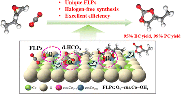 Abstract: Electronic-grade cyclic carbonates, synthesized via the cycloaddition of CO2 with epoxides, are important reagents widely used as lithium-ion battery electrolytes, polar aprotic solvents, and polymer monomers. However, current manufacturing processes rely on halide-containing catalysts, which lead to equipment corrosion and high energy consumption during product purification. The development of halogen-free catalysts is significant for enabling a greener upgrade of cyclic carbonate production. Here, a series of Ov-induced surface hydroxylated cobalt oxide catalysts (Co3O4−x(OH)y-T) were developed. Unique frustrated Lewis pair (FLP) structures consisting of Ovs and terminal hydroxyl groups attached to adjacent coordinately-unsaturated cobalt (Ov–cus.Co–OHt) were successfully fabricated on the Ov- and hydroxyl-enriched cobalt oxide surfaces. The most FLP-abundant catalyst, Co3O4−x(OH)y-170, shows excellent catalytic activity, achieving 95% yield of butylene carbonate and 99% yield of propylene carbonate under halogen-free conditions. Experimental and DFT calculation results reveal that the FLP structures not only improve CO2 adsorption but also favor intermediate desorption via forming a metastable d-HCO3 species, which breaks the tradeoff between CO2 adsorption and intermediate dissociation and enhances the catalytic activity of the developed cobalt oxide catalysts. The findings in this work provide a novel strategy for the green synthesis of cyclic carbonates.