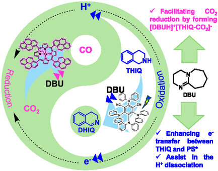 Abstract:Photocatalytic CO2 reduction to value-added chemicals is a pivotal approach toward achieving carbon neutrality. However, conventional photocatalytic systems typically rely on sacrificial electron donors that are unsustainable and yield low-value oxidation byproducts, thereby limiting their economic viability. In this work, a dual-functional photocatalytic architecture is reported, which is based on pyrene-appended iron porphyrin and organic photosensitizer in combination with 1,8-diazabicyclo[5.4.0]undec-7-ene (DBU) that achieves integrated redox transformations under visible light, addressing charge separation challenges. This system enables the simultaneous reduction of CO2 to CO with 98% selectivity (turnover number, TON=288), coupled with the oxidative semidehydrogenation of 1,2,3,4-tetrahydroisoquinoline (THIQ) to 3,4-dihydroisoquinoline (DHIQ) (TON=273), indicating excellent coupling efficiency of the redox reactions. Mechanistic investigations, including spectroscopic analysis and density functional theory calculations, have elucidated the pivotal role of DBU as a base and electron-transfer mediator in redox coupling reaction that is meticulously designed. This strategy offers an effective approach to sustainable photocatalytic platforms and underscores the potential of utilizing multifunctional additives to optimize both catalytic performance and reaction selectivity.