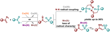 Abstract: Synthesis of α-sulfonylated ketazines from vinyl azides and sodium sulfinates proceeding via radical C–S/N–N coupling cascade has been developed. The cascade starts from the generation of sulfonyl radicals through RSO2Na oxidation by cerium(IV) ammonium nitrate (CAN). Their addition to the double bond of vinyl azides, followed by N2 elimination, leads to the formation of iminyl radicals, whose N–N coupling provides α-sulfonylated ketazines in yields up to 96%. This process represents one of the rare facets of iminyl radical reactivity, namely, N–N radical coupling while bypassing their reduction, intramolecular cyclization, and 1,n-HAT that are typical for them. The EPR-spectra study and quantum chemical calculations revealed that the selective N–N coupling of iminyl radicals was facilitated by the inertness of Ce(III) towards coordination with iminyl radicals and the inaccessibility of charge transfer. In contrast, Mn(II) coordinates with iminyl radicals and converts them into enamines.