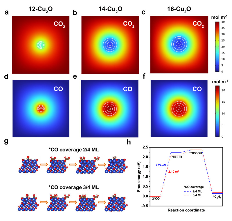 为了深入研究机理,我们结合有限元模拟(FEM)与密度泛函理论(DFT)进行了多尺度研究。FEM模拟表明(图4a-f),随着壳层增厚(12-Cu2O至16-Cu2O),空腔内CO2扩散受阻,浓度下降;而关键中间体*CO的富集程度呈现非单调变化。其中,14-Cu2O凭借均衡的空腔体积与最大孔径,在保障CO₂高效内扩散的同时实现了最优的*CO限域与富集,创造了最利于C-C耦合的微环境。进一步的DFT计算显示(图4g-h),更高的*CO覆盖度能降低C-C耦合这一决速步的能垒(3/4 ML时为2.10 eV vs. 2/4 ML时的2.24 eV)。因此,14-Cu2O通过其优化的几何结构协同促进了反应物传质与中间体富集,从而在原子尺度上降低了关键反应能垒,最终实现了优异的C2H4生成性能。