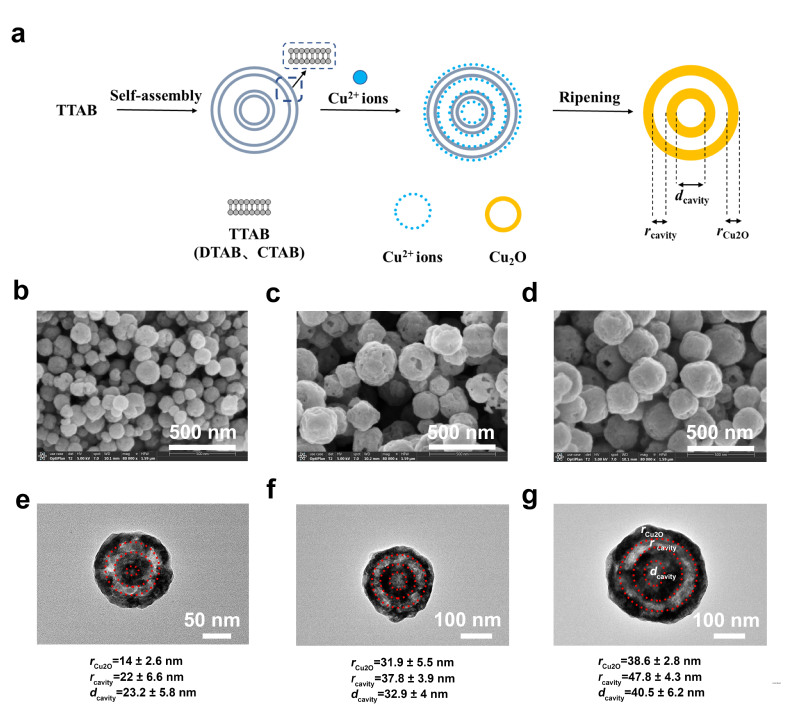 1. 提出一种基于表面活性剂链长调控的策略,成功构建了具有中空双壳层结构的Cu2O纳米反应器。
