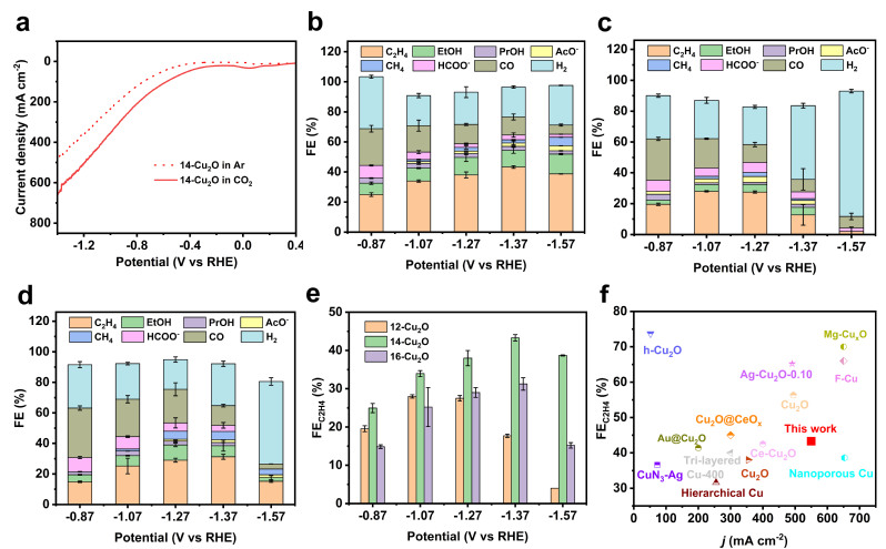 为了评估催化剂活性,在1 M KOH电解液的流动池中,通过恒电位电解及产物定量分析(气相色谱与核磁共振氢谱),系统评估了x-Cu2O系列催化剂在不同电位下的CO2还原性能(图3)。结果表明,14-Cu2O在‑1.37 V(vs RHE)及549.8 mA·cm-2的电流密度下,C2H4法拉第效率达到43.3% ± 0.8%,分别较12-Cu2O(28% ± 0.4%, ‑1.07 V)和16-Cu2O(31.5% ± 1.6%, ‑1.37 V)提高约1.55倍和1.39倍。14-Cu2O催化剂亦表现出较高的乙醇选择性(11.1% ± 1.98%),并抑制HER。性能差异主要源于其纳米空腔结构的优化:12-Cu2O空腔限域效应弱,且较大孔径可能导致结构坍塌,活性位损失与HER加剧;16-Cu2O虽空腔较大,但孔径较小限制了传质;而14-Cu2O兼具适中空腔体积与最大孔径,在保障CO2高效内扩散的同时实现了*CO的有效限域与富集,从而促进C‑C耦合,因而高选择性地生成C2H4。